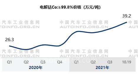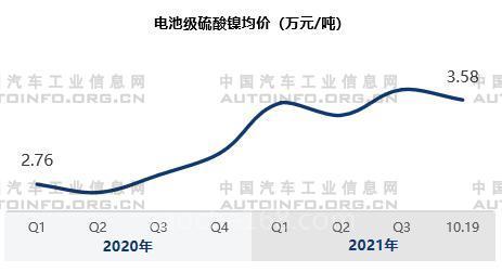 电池级硫酸镍价格逐步上涨,特别是2020年下半年价格涨幅较大,2021年呈现起伏上升趋势,目前价格为3.58万元/吨,10月份价格有起伏下降趋势,预期未来价格起伏变动中趋稳。