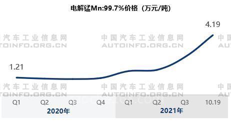 2021年第二季度开始涨幅明显,特别是进入8月之后,电解锰价格暴涨。随着限电限产政策的不断发酵,加之海外电解锰价格的暴涨,短期内国内电解锰价格易涨难跌。
