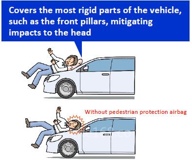 众多日本交通事故中,行人相关的交通死亡率最高,而主要死因均为头部受伤。而此次推出的行人保护气囊覆盖于车辆的刚性部件上,例如引发致命伤害最高的前柱。车身被覆盖的每个部分的内部压力都被调整到最佳水平,从而减少对头部的冲击。