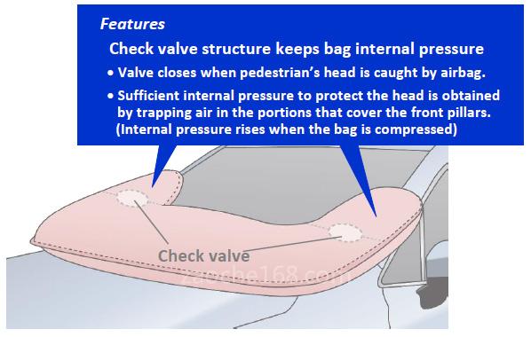 该保护气囊的特点为:采用止回阀结构以保持气囊内压力。当行人的头部被气囊卡住时,阀门会自动关闭;通过获得覆盖前柱的空气,可以获得足够的内部压力,从而保护好头部。(当内部压力上升时,气囊会被压缩)。