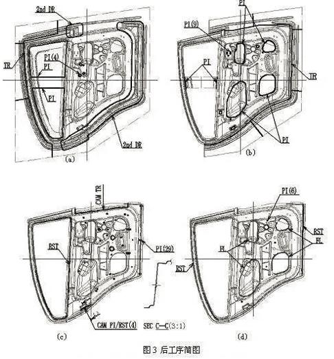 产品冲压成形工艺的确定过程,就是分析和预测板料在变形过程中可能产生的缺陷,并采取一定的措施,以消除和防止冲压缺陷,同时考虑制造能力、冲压设备、投资成本等因素。根据本零件的工艺性和本身的结构特点,结合实际生产情况,车门内板的工艺过程如下:拉延+切角;二次拉延+切边+冲孔;切边+冲孔;侧切+侧冲孔翻孔+冲孔+整形;整形+冲孔。