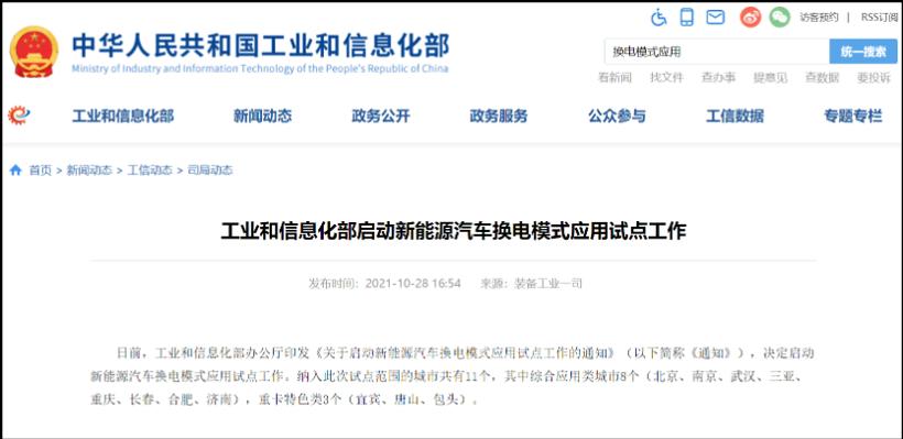 10月28日,工业和信息化部办公厅印发《关于启动新能源汽车换电模式应用试点工作的通知》,决定启动新能源汽车换电模式应用试点工作。纳入此次试点范围的城市共有11个,其中综合应用类城市8个(北京、南京、武汉、三亚、重庆、长春、合肥、济南),重卡特色类城市有3个(宜宾、唐山、包头)。