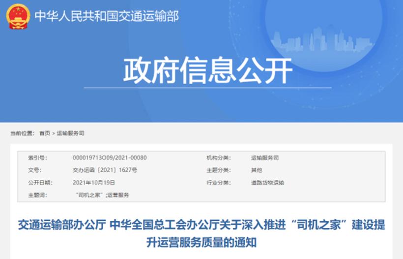 10月19日,交通运输部网站发布《交通运输部办公厅 中华全国总工会办公厅关于深入推进“司机之家”建设提升运营服务质量的通知》,要求各级交通运输主管部门、工会组织因地制宜开展“司机之家”建设运营,推出让货车司机愿意用、用得起的餐饮、停车、休息、洗浴、洗衣等服务,加强对已投入运营“司机之家”服务质量的跟踪监测,切实改善广大货车司机停车休息环境和条件。