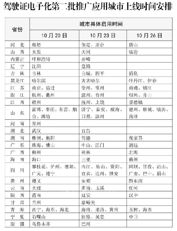 据了解,驾驶证电子化第二批推广应用城市多、覆盖面广、申请高峰压力大,为保证电子驾驶证及时受理、及时生成、及时发放,公安部交通管理局细化组织部署,制订工作方案和技术方案,指导各地公安交管部门落实人员、设备、系统等各项保障,自10月20日至26日分3批次错峰上线电子驾驶证申领功能,确保驾驶证电子化顺利推广应用。下一步,公安部交通管理局将加快推进驾驶证电子化全国推广应用,争取今年年底前全面推行,进一步扩大改革成效,不断提升交管服务便利化水平。