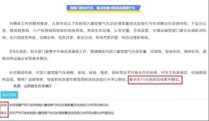 针对摸排结果,对国六重型燃气车销售、使用、检验、维修、回收等环节开展全方位检查,对车主拆除倒卖、经销商回收返现、维修厂虚假维修、检验机构弄虚作假等四类违法违规行为予以查处。要求在11月底前完成集中整治。