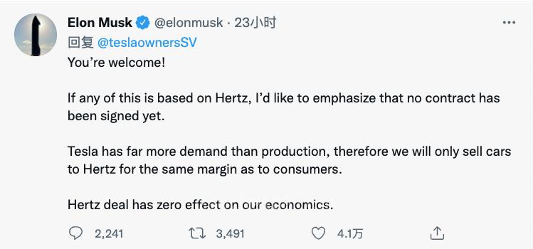 据外媒报道,埃隆·马斯克(Elon Musk)表示,在汽车租赁公司Hertz宣布与特斯拉达成大规模交易一个多星期后,双方还未签订合同。