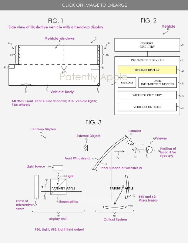 苹果所获专利中就有一种平视显示器,可能会产生从其中一个车窗反射到观看者(例如驾驶员或车内其他乘客)的输出。