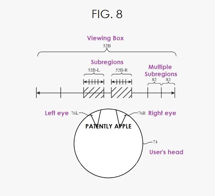 下图8为观看者和相关联的平视显示器观看区域(观看框)的俯视图,该区域具有与观看者的左眼和右眼对齐的子区域。