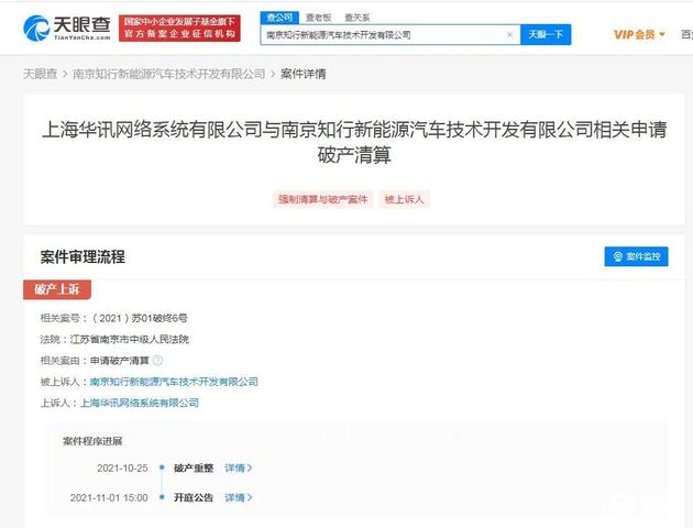 事实上,早在7月12日,南京知行新能源汽车技术开发有限公司新增破产重整信息,案号为(2021)苏0113破申26号,经办法院为南京市栖霞区人民法院,申请人为上海华讯网络系统有限公司。