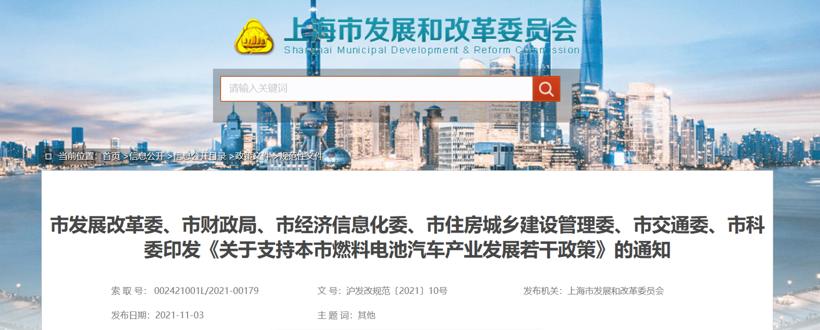 2021年11月3日,上海市发展改革委、市财政局等相关部门印发了《关于支持本市燃料电池汽车产业发展若干政策》(以下简称《若干政策》)的通知。