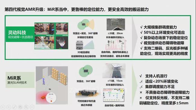 在移动机器人行业,AMR已经经历磁条技术、二维码技术、激光SLAM等多种导航方式的技术迭代,灵动科技在此基础上开发出第四代视觉自主导航AMR,在柔性化生产替代传统、规模化生产方式大势下,灵动科技可以实现大规模集群调度、50%以上环境变化、复杂动态场景下的稳定定位,以及动态障碍物识别,在整车厂不同车间实现良好适配。