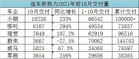 具体来看,包括小鹏、理想、哪吒、零跑、威马等5家新势力车企在10月都实现交付量同比增长。