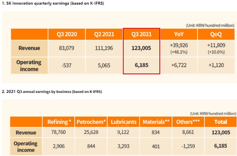 在业绩方面,SKI第三季度实现销售123,005亿韩元,营业利润为6,185亿韩元。其中,由于今年上半年开始量产的中国盐城和惠州工厂开工率提高,SKI第三季度电池销售额创下8,168亿韩元的新高,前三季度累计实现19,733亿韩元,预计年销售额将超过3万亿韩元。SKI预计在2022年,电池年销售额将达到6万亿韩元左右。