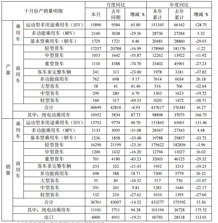 分车型来看,上个月MPV和轿车销量均出现了较大幅度的下滑。其中MPV 10月销量为2133辆,同比大幅下跌31.08%;1-10月MPV总销量为28,567辆,同比增长4.48%;轿车10月销量为1,236辆,同比下滑33.48%;1-10月轿车共计卖出了19,788 辆,同比下跌33.72%。SUV车型作为销售主力,10月销量达13,752辆,同比增长40.7%;1-10月累计销售15.2万辆,同比大幅增长131.5%。