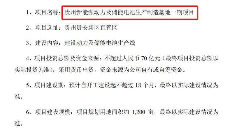 贵州项目落地于贵州省贵安新区直管区,项目规划用地面积约1200亩,建设期预计不超过18个月,主要建设动力及储能电池生产线。