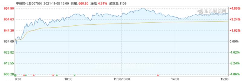 上述公告发布后,11月8日,宁德时代盘中快速上涨,5分钟内涨幅超过2%,截至收盘,上涨4.21%,报660.8元,总市值15390亿元。