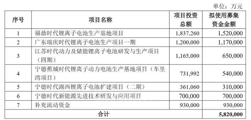 宁德时代582亿定增投资项目;图片来源:宁德时代公告截图