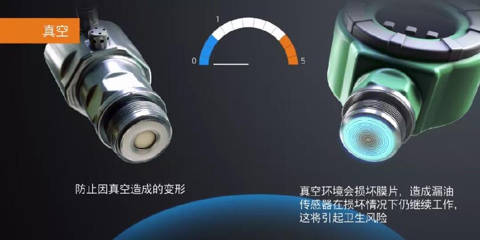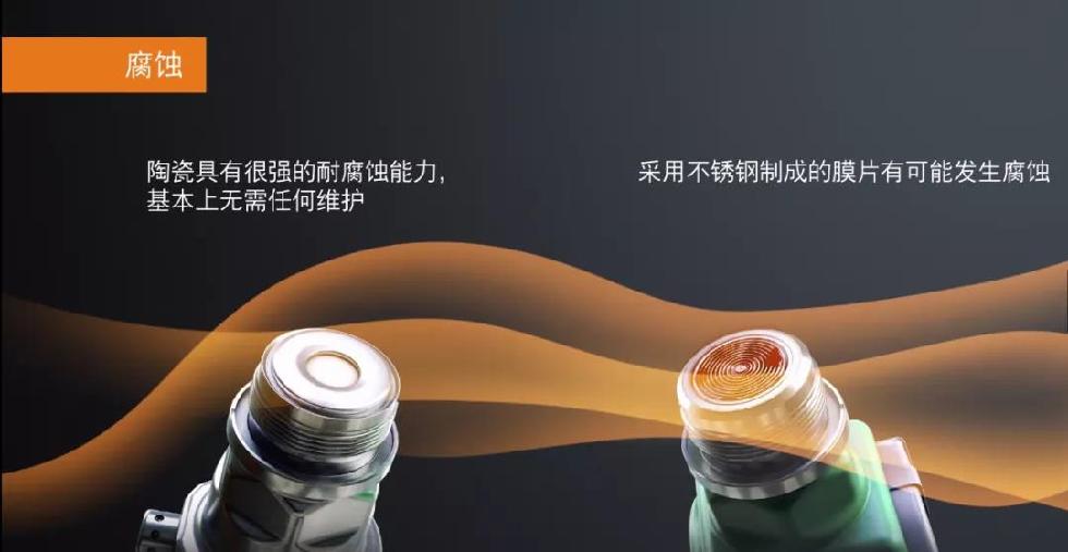 相对于不锈钢隔膜充油式的压力传感器,陶瓷电容感应元件的压力传感器(如下图左侧产品)优势众多: