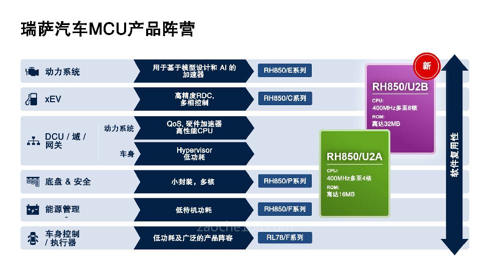 28纳米RH850/U2B专为区和域应用而设计,在瑞萨用于动力总成的RH850/E2x系列和用于HEV/EV电机控制的RH850/C1M-Ax系列的关键功能基础上,增加了全新加速器IP、提升了性能和安全性。这些改进使用户能够将多种ECU功能集成至单个ECU中,同时满足严苛的汽车级安全、加密和实时操作性要求。