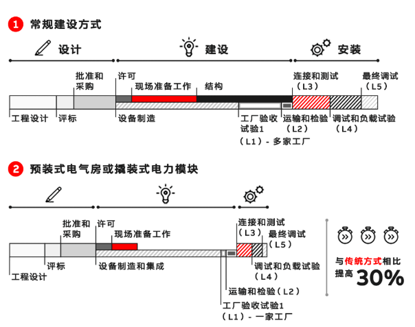设计:预装式电气房是预制的可移动电源模块。它经过定制设计和工厂测试,满足了独特的数据中心规范,并借助现代模块化预制解决方案,可实现在不到18个月的时间内建成并运行。
