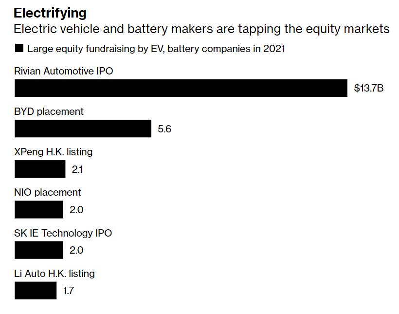 今年规模最大的IPO正是来自电动汽车行业的Rivian。11月初,电动皮卡制造商Rivian在美国上市,融资137亿美元,目前股价较发行价已上涨47%。