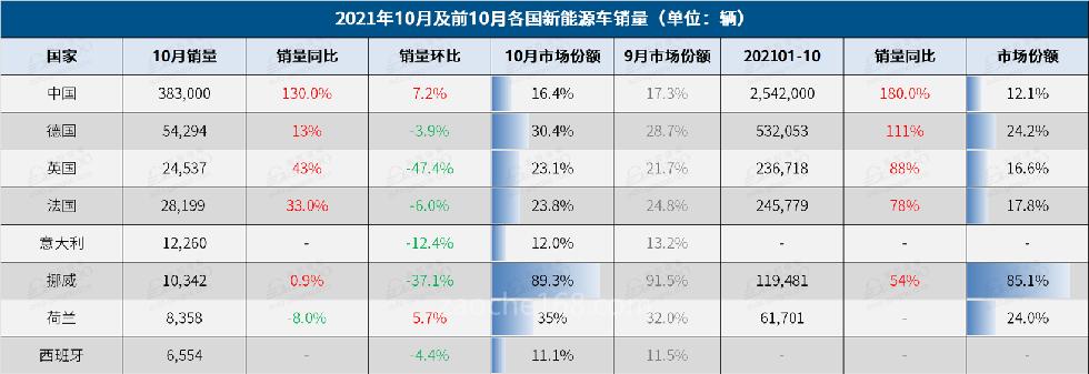 不过值得注意的是,在缺芯的背景下,全球新能源汽车销量的高增长逐渐放缓,同比增幅有所收窄,环比甚至出现两位数的跌幅。在荷兰,电动汽车的销量甚至罕见地出现了下滑,不过这跟去年年底荷兰出台电动车补贴导致电动车注册量迅速提升有关。挪威上月的电动车市场份额也较9月份降低,或是跟特斯拉10月份并没有在挪威交付车辆有关。