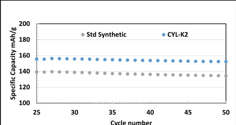 延长循环表现出可逆充/放电行为,经过50次循环后,总容量损失小于10%。相比之下,经过C/5稳定循环(25-50次),性能最佳的脉状石墨材料提供了155mAh/g的平均可逆容量,而标准合成石墨为139mAh/g。电池在全电芯系统中以C/5的速率进行测试,相当于5小时充电和5小时放电,每天大约可完成2个以上的完整循环,即25到50次循环。