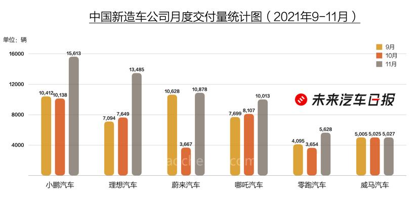 被形容销量“恐怖”的小鹏汽车,在几家新势力中最晚发布销量。11月,小鹏以15613辆的交付成绩,位列新造车阵营销量榜首。亚军是理想汽车,月交付量达到13485辆,较上月增加了5836辆。蔚来汽车则重回“万辆俱乐部”,11月共交付了10878辆新车。
