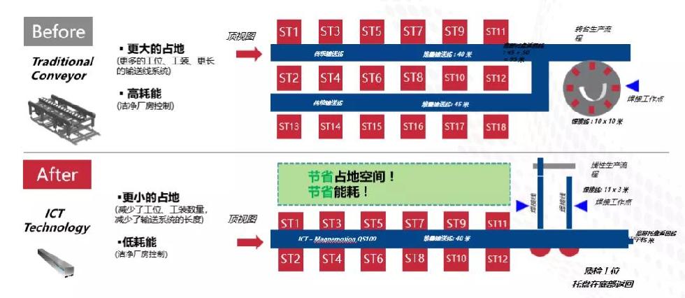 而罗克韦尔自动化ICT输送解决方案,采用磁悬浮输送技术,大大减少了金属粉尘及抖动的影响,降低了影响产品质量的风险。并且占地面积更小,有效的节约了企业用能成本。从安全、节能、环保、高效四个方面均对企业有所提升。