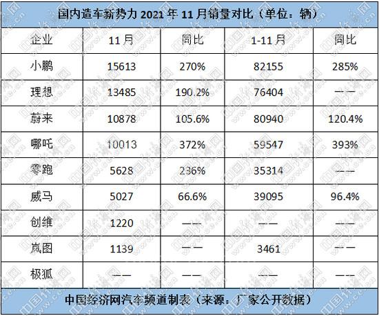 随着芯片短缺危机的缓解,国内造车新势力的销量在11月迎来一轮普涨。其中,小鹏、理想、蔚来、哪吒等4家企业在11月的销量均超万辆。“这几家新势力的月均销量破万辆,意味着它们的年销量就能突破10万辆”。