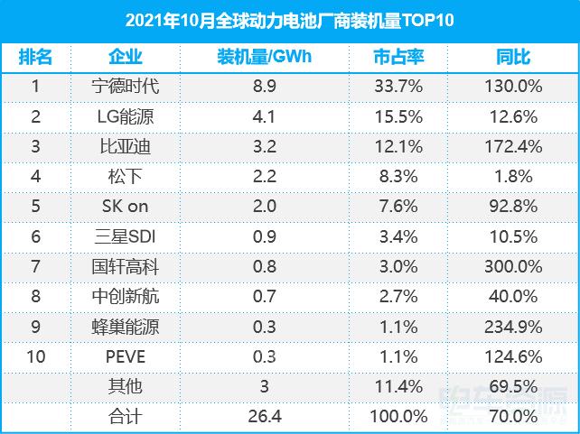据数据显示,2021年10月,全球动力电池装机量达到26.4GWh,同比增长70%,中国本土企业均实现同比上涨。排名TOP10的企业分别是宁德时代、LG新能源、比亚迪、松下、SK on、三星SDI、国轩高科、中创新航(中航锂电)、蜂巢能源和PEVE,10家企业合计市场份额达88.6%。
