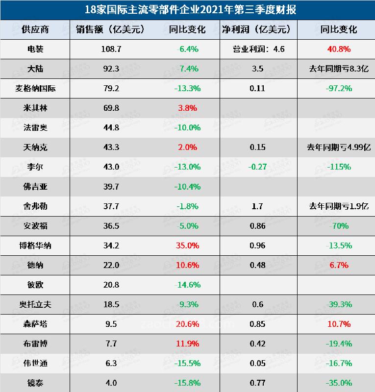 不过,在种种不利因素下,米其林、天纳克、博格华纳、德纳、森萨塔和布雷博这几家企业的营收却逆势上涨,后四家企业甚至实现了两位数的增幅。米其林表示,上个季度全球大部分地区对卡车轮胎的需求都有所增长,另外,农作物和金属价格的上涨帮助其销售了更多用于采矿机械和农用机械的轮胎。博格华纳营收增长主要是因为收购德尔福技术公司带来的收入增长,以及产品需求的增加“完全抵消了生产下降的影响”。森萨塔则将营收增长归功于产品需求的显著增长和渠道补充,以及公司快速有效地适应不断变化的市场条件和广泛的供应链中断的能力。