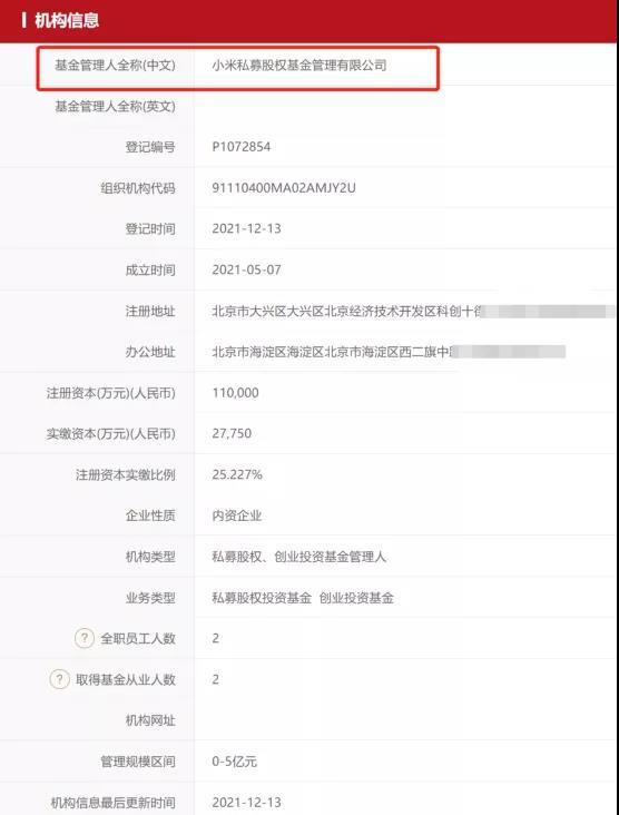 备案信息显示,小米私募成立于2021年5月7日,登记时间为2021年12月13日,注册资金11亿元,实缴资本2.775亿元,是一家私募股权、创业投资基金管理人。