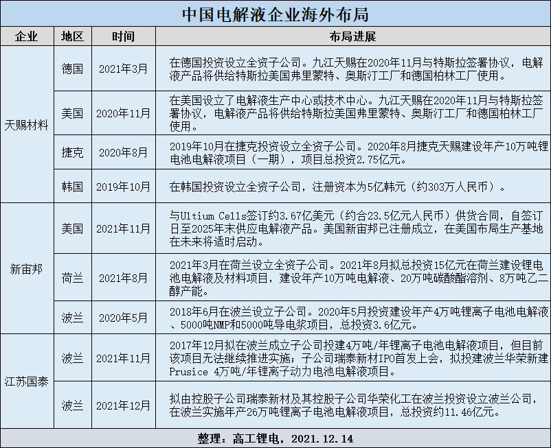 全球电动化加速,动力电池产业链导入本土化生产的需求迫切,带动中国电解液企业集体出海。