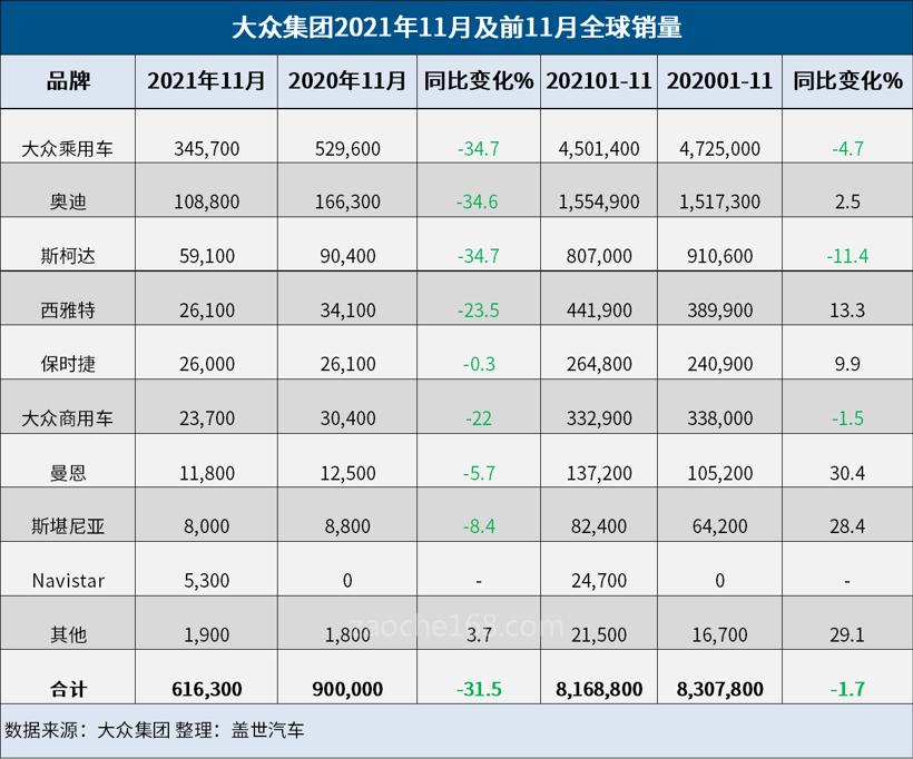 最近四个月,由于芯片短缺,大众汽车的全球月度销量均略高于60万辆,均较去年同期下降逾30%。其中,8月的销量为61.65万辆,9月的销量为62.62万辆,10月的销量为60.09万辆,11月的销量为61.63万辆。然而,此前七个月,除2月外,其余月份的销量均保持在70万至90万辆。