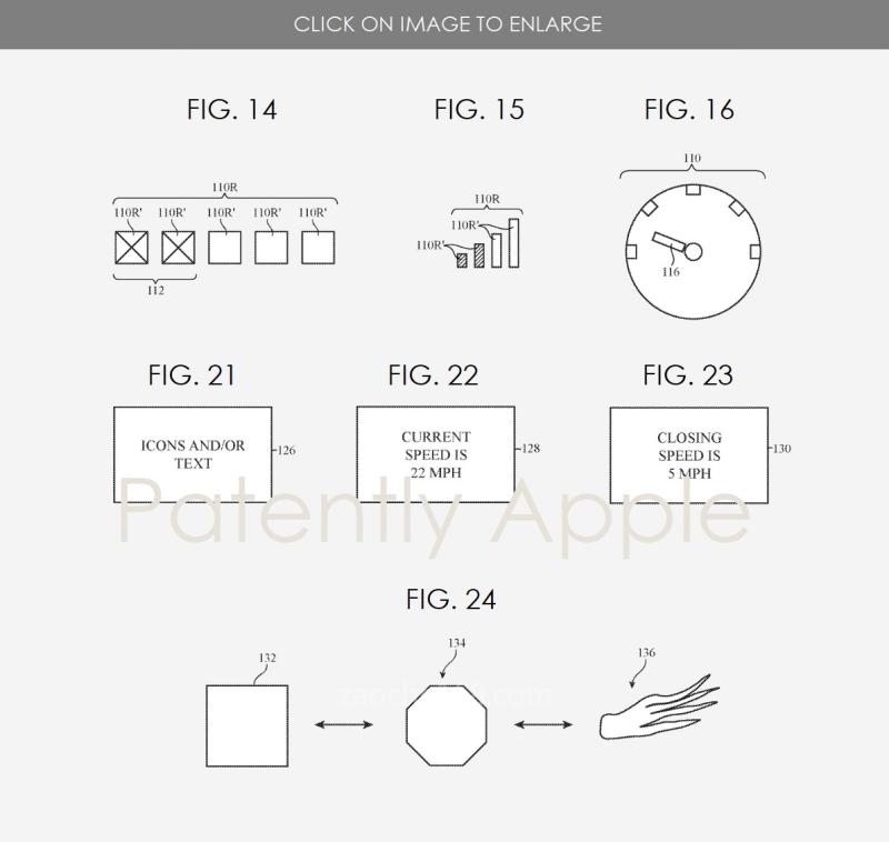苹果专利图11-13,展示了一种更具交流性的方式,可在不同时间点传递车辆不同级别的刹车。图25和26为带有外部照明的说明性车辆的侧视图,其中一个附加了文字;图27为说明性流程图,演示了在产生基于光的警告和其他输出的同时操作车辆和相关系统所涉及的步骤。