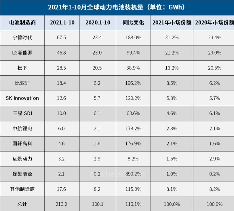 就韩国市场研究机构SNE Research公布的数据显示,在今年1-10月全球动力电池装机量Top 10榜单中,中国有6家电池制造商上榜,含宁德时代、比亚迪、中航锂电、国轩高科、远景动力以及蜂巢能源,而这六家占据了全球47%市场份额。
