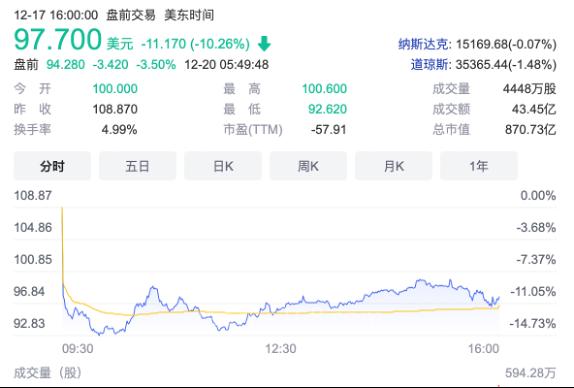 12月16日,美股盘后,被称为“特斯拉杀手”的Rivian公布了上市后的首份财报。财报披露,公司今年第三季度,共计实现营收100万美元,营业亏损7.76亿美元,净亏损12.33亿美元。发布公告后,Rivian报108.87美元/股,跌5.33%,截至今日发稿,Rivian股价已跌至97.70美元。