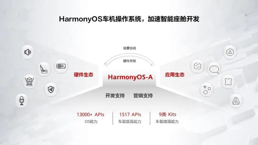 为了帮助应用伙伴更快地在HarmonyOS上开发应用,华为还增量开发了9大类车载增强能力,开放了14500多个HarmonyOS基础及车域增量特性API。同时提供全面的开发工具和技术支持,降低软件应用集成与开发难度,从而降低座舱系统的集成与开发难度,帮助伙伴快速开发和迁移应用,为用户带来丰富的人车生活体验。