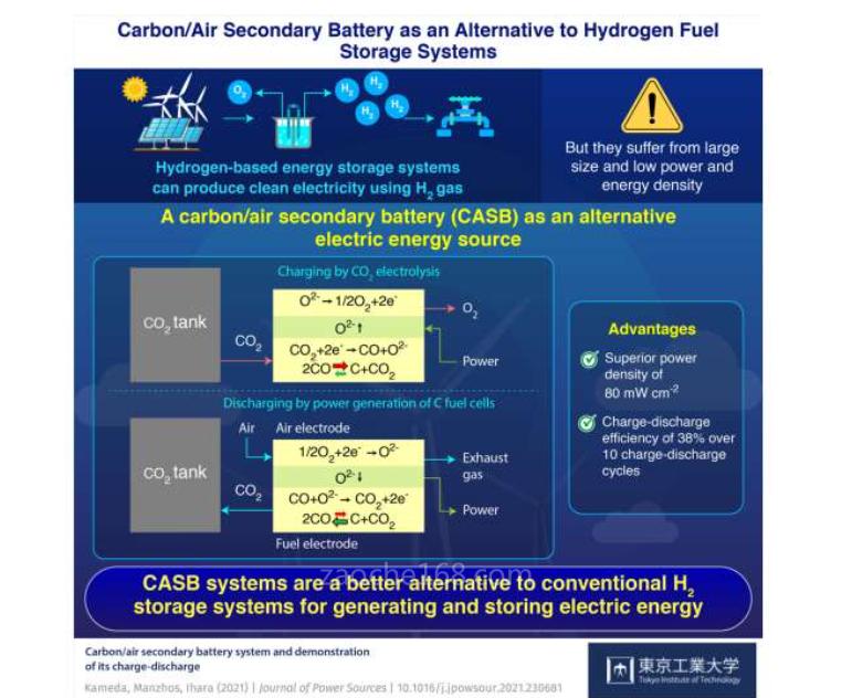 据外媒报道,东京工业大学(Tokyo Tech)的研究人员提出一种替代性电能储存系统,以碳为能源,而不是氢气。新系统名为碳/空气二次电池(CASB),由固体氧化物燃料和电解电芯(SOFC/ECs)构成,利用电解二氧化碳(CO2)产生的碳,与空气氧化产生能量。通过向SOFC/ECs供应压缩液化CO2,以构建能量储存系统。