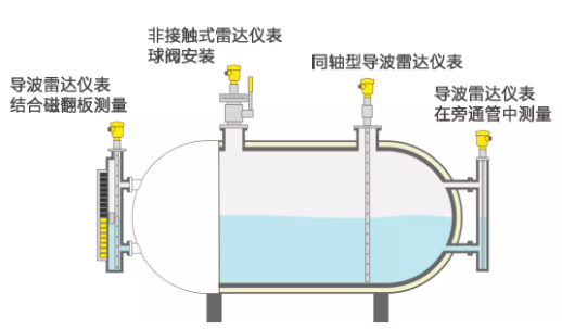 为了维护方便,LNG工厂常常会要求仪表拆装时也无需中断工艺过程。除了上述的非接触式的雷达仪表外,另一种方案是将导波雷达仪表安装在容器侧面的旁通管。由于在容器和旁通管之间安装了阀门,因此,也可以实现仪表与工艺过程的分离。