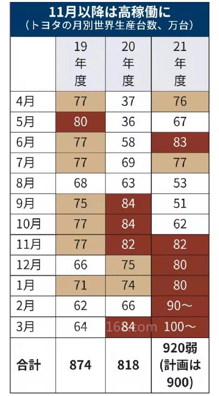 根据丰田本周公布最新数据,其11月全球生产为82万辆,12月计划规模为80万辆,如果算上2022年1-3月的生产计划,2021财年的全球生产将略低于920万辆。