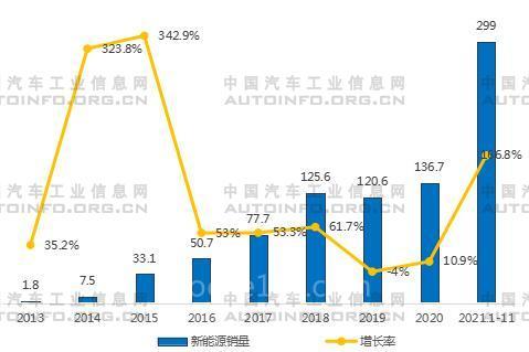 中国新能源汽车销量及增速(万辆)