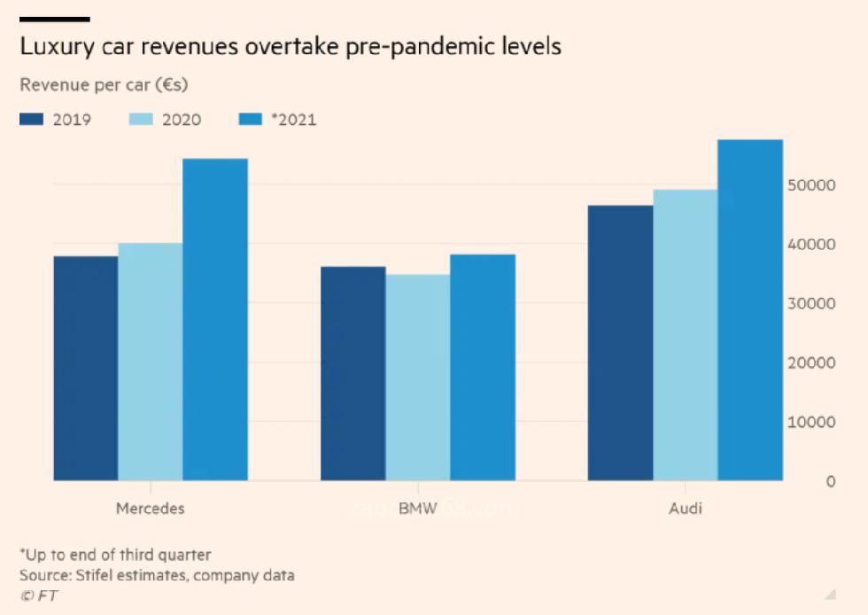 斯蒂费尔银行(Stifel bank)为英国《金融时报》进行的分析显示,与2019年疫情大流行前的水平相比,宝马、奥迪和梅赛德斯-奔驰的每辆车收入平均增长了近25%。
