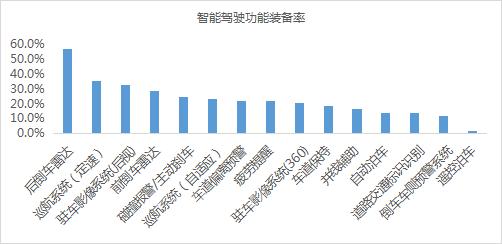 从具体智能驾驶功能的装备率来看,定速巡航、前后倒车雷达等基础ADAS功能及传感器硬件的装备已经超出20%的装备率。自适应巡航、车道保持、自动泊车等横纵向辅助控制功能的装备率达到或接近20%的装备水平,市场空间仍较大。