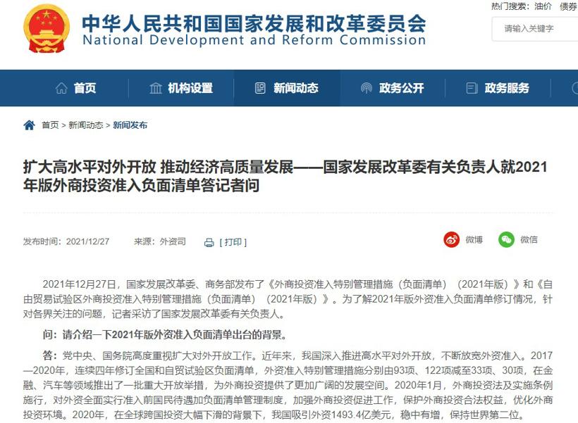昨日,国家发展改革委、商务部发布了《外商投资准入特别管理措施(负面清单)(2021年版)》和《自由贸易试验区外商投资准入特别管理措施(负面清单)(2021年版)》,明确指出,取消乘用车制造外资股比限制以及同一家外商可在国内建立两家及两家以下生产同类整车产品的合资企业的限制。
