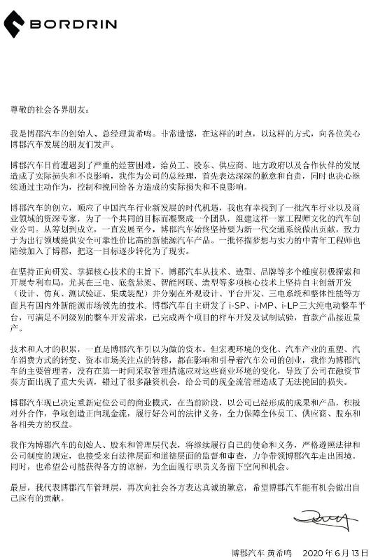 2020年6月13日,博郡汽车创始人黄希鸣在一份信件中称,由于公司经营问题给各方造成了实际损失和不良影响,将力争带领博郡汽车走出困境。“非常遗憾,在这样的时点,以这样的方式,向各位关心博郡汽车发展的朋友们发声”,黄希鸣表示,博郡汽车目前遭遇到了严重的经营困境,给员工、股东、供应商、地方政府以及合作伙伴的发展造成了实际损失和不良影响,对此表达深深的歉意和自责,同时也决定继续通过主动行为,控制和挽回给各方造成的实际损失和不良影响。”
