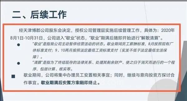2020年7月,据媒体曝光的一份内部文件显示,由于控股股东融资失败,公司已无恢复正常经营的可能性,天津博郡股东会决定授权公司管理层处理后续管理工作,在2020年8月1日—10月31日期间,公司将会进入“歇业”状态,“歇业”期满后将进入“解散清算”状态。