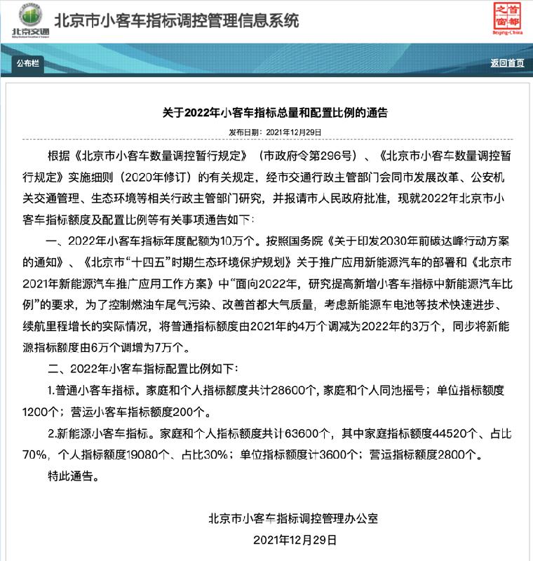 12月29日,北京市小客车指标调控管理办公室发布《关于2022年小客车指标总量和配置比例的通告》。明年,北京小客车指标年度配额为10万个。其中,普通指标额度由2021年的4万个调减为3万个,新能源指标额度由6万个调增为7万个。