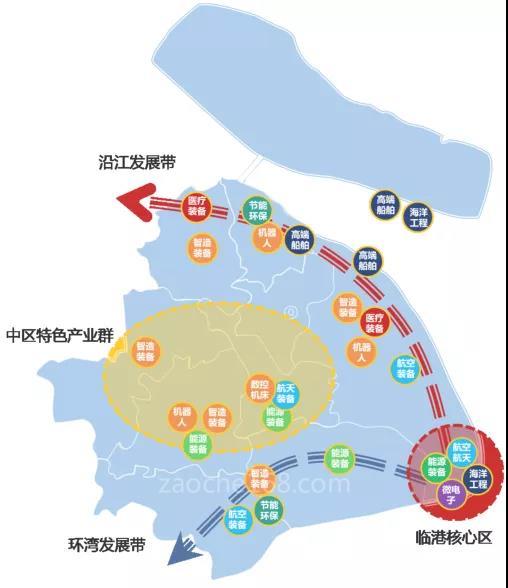 按照协同布局、相辅相成的发展原则,形成沿江和环湾两大高端装备集聚发展带。沿江发展带主要包括浦东新区、宝山区、嘉定区和崇明区等,重点布局智能制造装备、民用航空装备、船舶海工装备、高端能源装备、高端医疗装备等产业。环湾发展带主要包括奉贤区、金山区等,重点布局智能制造装备、民用航空装备、高端能源装备等产业。